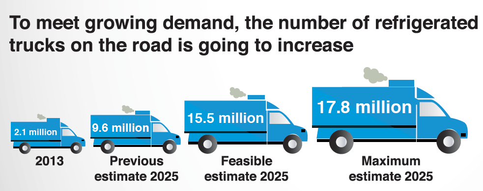 - Impact of refrigeration on air pollution - To meet the demands a changing diet of the middle class the number of refrigerated trucks is estimated to increase from 2.1 Million in 2013 to 17.8 million in 2025. Many of the refrigerated trucks in developing countries are kept cold by a separate diesel engine which uses up to 20% of the vehicles diesel consumption, producing up to 6 times more Nitrogen Oxide compared to modern trucks.