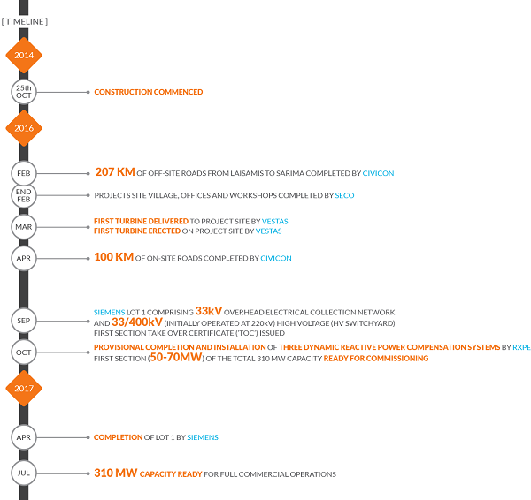 Since its commissioning, the project has made several strides as it heads towards its official launch. Such milestones include the construction of the project site (which hosts the project offices), delivery of the 30 turbines which are expected to inject 90MW into the national grid by September this year. Beyond this, the project has a number of infrastructural benefits to the locals such as the completion of 207Km off-site and 100Km on-site roads. The graphical tracker below captures the milestones that the project has had since commissioning two years ago.