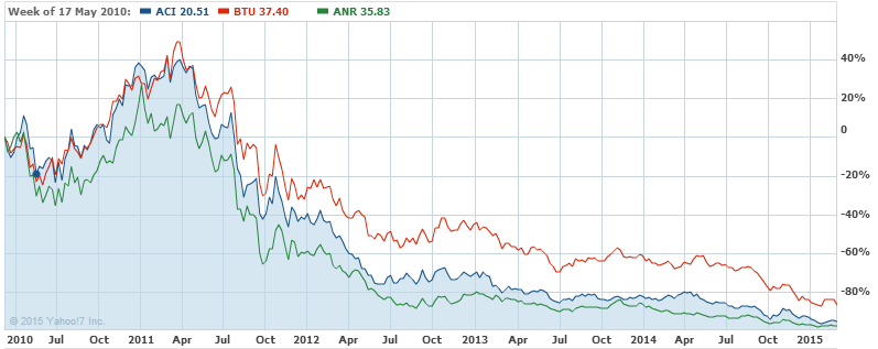 Stock prices of three of America's biggest coal companies over the past five years - Peabody, Arch Coal and Alpha Natural Resources. Credit: Yahoo Finance