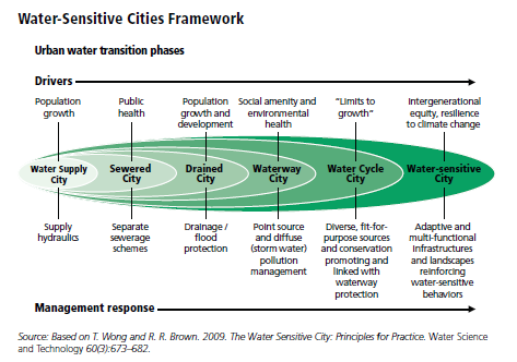 In the developed world, we have enjoyed growth at a more sustainable rate and have been able to adequately service our population’s water and wastewater needs though traditional engineering infrastructure. However, we are now learning that these traditional approaches have unintended consequences such as emissions intensity, environmental degradation and urban flooding. These issues have seen the rise of movements such as Water Sensitive Urban Design (WSUD), Sustainable Urban Drainage Systems (SUDS), Integrated Water Management (IWM) and the advancement towards water sensitive cities.